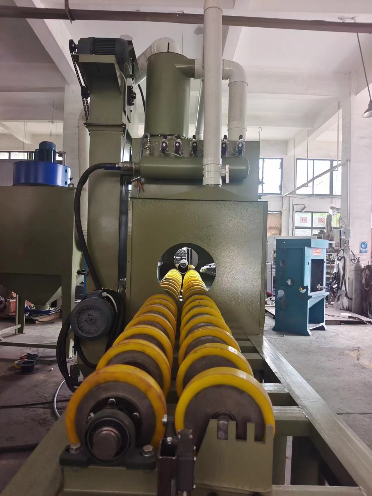 本類機(jī)型適用于,管件,輥軸類圓柱形工件的表面處理噴砂工藝。 材質(zhì)不限如:鐵管、